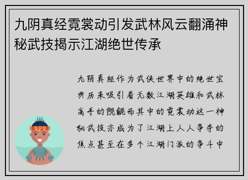 《羽化传奇:从武林外传到江湖风云,穿越时空的英雄征途》是一部融合了武侠、历史与奇幻元素的作品,探索了从古代武林到现代社会的英雄传说。本文将通过四个方面对其进行深入阐述:第一,作品的背景和设定,揭示其独特的时代交替与跨时空构建;第二,主人公的成长与蜕变,分析其从“普通人”到“江湖豪杰”的奋斗历程;第三...